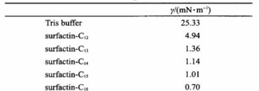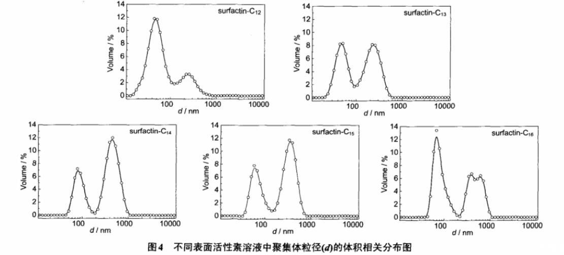由圖4可知,從相對體積比例來看,鏈長較短的surfactin-C12大部分是形成直徑為40 nm左右的膠束,少部分形成直徑大于200 nm的膠束聚集體。隨著表面活性素烷基鏈的增長,形成的聚集體的直徑明顯增加,也有更多的大粒徑聚集體形成。