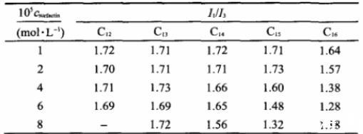 表3表面活性素濃度對膠束微極性(I1/I3)的影響
