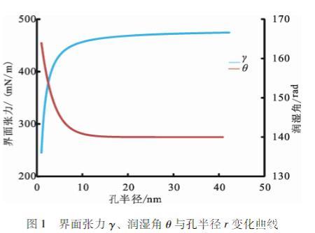 圖1界面張力γ、潤濕角θ與孔半徑r變化曲線