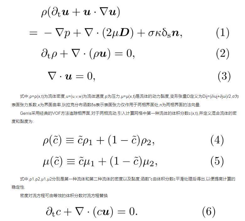 Gerris采用經(jīng)典的VOF方法追蹤相界面,對于兩相流動,引入計算網(wǎng)格中第一種流體的體積分?jǐn)?shù)c(x,t),并定義混合流體的密度和黏度為:
