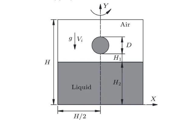 如圖1所示,水滴撞擊深水液池的數(shù)值模擬在軸對稱坐標(biāo)系中進(jìn)行,Y軸為計算區(qū)域的對稱軸,D為初始水滴直徑,R=D/2,正方形計算區(qū)域的長度H=20D,水滴距離液面的距離H1=0.1D,液池深度H2=12D以消除底部對液滴撞擊運(yùn)動的影響,水滴在重力g和撞擊速度Vi的作用下撞擊液池。采用雷諾數(shù)、韋伯?dāng)?shù)和弗勞德數(shù)來描述液滴撞擊的運(yùn)動特征,三者分別表征液體慣性力與黏滯力間的關(guān)系、液體慣性力與表面張力間的關(guān)系以及液體慣性力與重力間的關(guān)系。三個無量綱參數(shù)的表達(dá)式如(7)式所示,主要物理參數(shù)如表1所列。