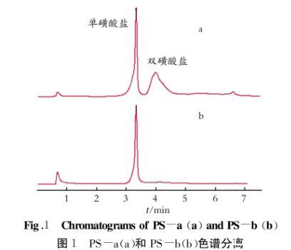 從色譜圖及色譜數(shù)據(jù)分析結(jié)果得知:PS-a和PS-b均含有單磺酸鹽和雙磺酸鹽,但兩者所含單、雙磺酸鹽的量差別較大;如果以峰面積為評(píng)價(jià)標(biāo)準(zhǔn),樣品PS-b中幾乎不含雙磺酸鹽部分,而樣品PS-a中單、雙磺酸鹽所含比例相當(dāng),約為1∶1。
