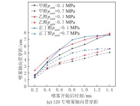 環(huán)境溫度升高至70℃、120℃時(shí),正如圖8(b)和圖8(c)呈現(xiàn)出的,正丁醇的噴霧軸向貫穿距高于甲醇和乙醇,這與常溫常壓的環(huán)境條件下完全相反。盡管正丁醇的潛熱較低,但環(huán)境溫度和壓力的升高使甲醇和乙醇的過熱度高于正丁醇,進(jìn)而引發(fā)更高的顯熱,提升了甲醇和乙醇的蒸發(fā)率,導(dǎo)致醇束發(fā)展緩慢。
