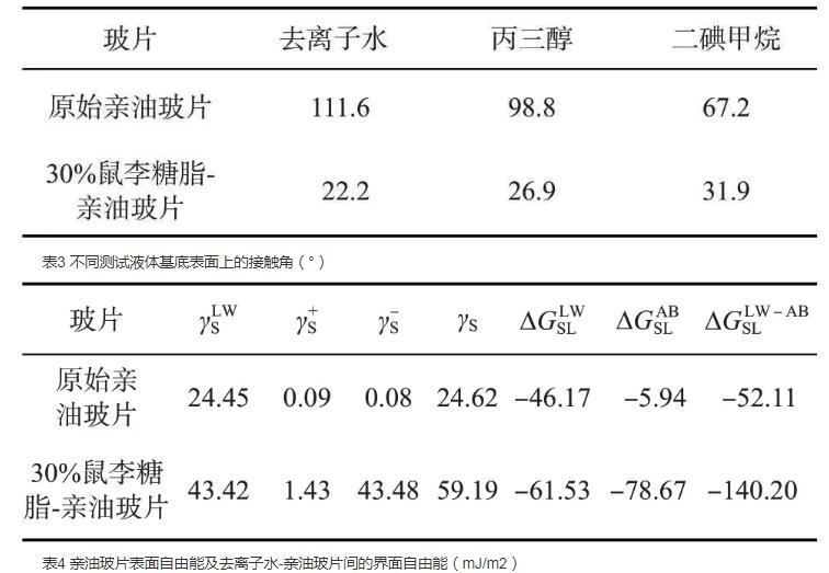 原油開采及運移過程中,巖石表面潤濕性對提高采收率十分重要,而巖石表面自由能變化是研究其潤濕性改變的基礎,也是其他物質與巖石間相互作用的具體體現。本研究主要采用去離子水(Lewis酸堿呈中性)、丙三醇(極性液體)及二碘甲烷(非極性液體)作為檢測液體原始親油玻片及30%鼠李糖脂溶液處理后的親油玻片,計算固體表面自由能,結果見表3和表4。由不同測試液體基底表面上的接觸角(表3)可見,無論何種測試液體體系,經過30%鼠李糖脂溶液的作用,親油玻片的水濕性顯著提升,尤其是在去離子水中。兩種親油玻片表面的自由能及去離子水-親油玻片間的液-固界面自由能見表4。經30%鼠李糖脂溶液處理后,親油玻片表面的水相潤濕角顯著下降,導致原始親油玻片的固體表面能γS僅為24.62 mJ/m2,而30%鼠李糖脂-親油玻片的γS卻達到59.19 mJ/m2,為原始親油玻片的1.5倍。此外,基于Young公式和DLVO擴展理論及式(5)—式(7)分析,兩種條件下的親油玻片與去離子水間總存在吸引力,在原始親油玻片與去離子水間的界面相互作用能中,Lifshitz-van der Waals分量更大,說明其界面間主要依靠van der Waals相互作用;而在30%鼠李糖脂溶液作用后的親油玻片與去離子水間作用能中,Lifshitz-van der Waals作用和Lewis酸堿相互作用均存在,因此30%鼠李糖脂-親油玻片與去離子水間的ΔGLW-ABSL更低。自由能越低說明熱力學更穩定,因此相較于原始親油玻片來說,水更易在鼠李糖脂處理后的親油玻片表面吸附。由此可以推測,鼠李糖脂在界面比原油極性分子展現出更強的競爭吸附能力,可將吸附在巖石表面的原油分子脫附,最終改變儲層潤濕性。