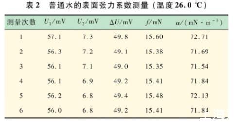 用游標卡尺測量金屬圓環:外徑D1=3.500 cm,內徑D2=3.334 cm,調節上升架,記錄環在即將拉斷水柱時數字電壓表讀數U1,拉斷時數字電壓表的讀數U2,結果見表2。求平均值得出此溫度下普通水的α=71.96 mN/m。