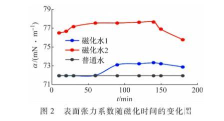 (1)從圖表可以看出,磁化水2在最初的前60 min內表面張力系數有了較大的變化,最大差值為7.8%