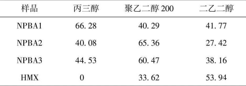由表5可知,NPBA3與HMX的粘附功最大(113.34 mN/m),且界面張力最小(4.81 mN/m),表明3種NPBA中NPBA3與HMX的浸潤(rùn)性(粘結(jié)性)最好,且外力破壞粘接界面需做的功(粘結(jié)強(qiáng)度)最大。與NPBA1相比,雖然NPBA2與HMX的粘附功相對(duì)較大(分別為75.06 mN/m和78.38 mN/m),但其界面張力相對(duì)也大(分別為21.51 mN/m和24.12 mN/m),表明NPBA2與HMX的粘結(jié)強(qiáng)度大于NPBA1,但浸潤(rùn)性略弱。