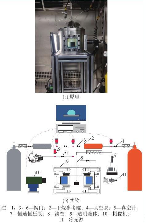 含瓦斯煤與水之間接觸角測試設備具備抽真空、充氣吸附、恒溫控制、滴水、光學成像及自動采集數據的功能,設備的實物圖及原理分別如圖1a—圖1b所示。
