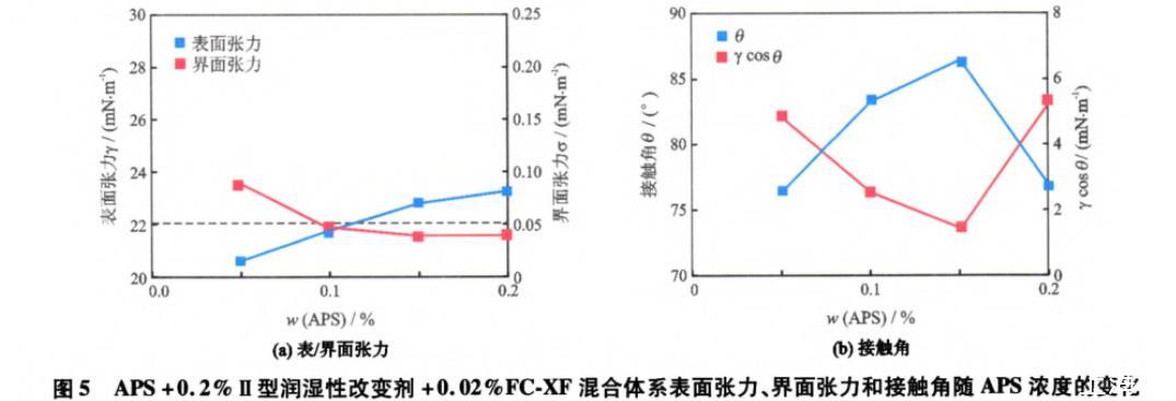從圖5(a)中可以看出,隨著APS質(zhì)量分數(shù)的增加,體系的表面張力增大,界面張力減小,這與FXCF對表/界面張力的影響機制相同。從圖5(b)中可以看出,隨著APS質(zhì)量分數(shù)的增加,體系與巖石的接觸角先增加再減小,相應(yīng)的γcosθ先減小再增大,均出現(xiàn)極值點,這與圖4(b)的變化趨勢不同。這是因為吸附Ⅱ型潤濕性改變劑和FC-XF使得巖石表面由水濕轉(zhuǎn)變?yōu)槿跤H水性潤濕(接觸角<75°),更易于吸附APS的親水頭基而使碳氫鏈在巖石表面暴露,這降低了巖石表面的親水性,因而隨著APS質(zhì)量分數(shù)的增加接觸角增大。但是,當APS質(zhì)量分數(shù)大于0.15%后,過多的APS分子可能在巖石表面發(fā)生雙分子層吸附或因競爭吸附而降低Ⅱ型潤濕性改變劑的吸附量,使得巖石表面的親水性增加。而且,接觸角的變化決定了γcosθ的變化趨勢,因而接觸角和γcosθ隨APS質(zhì)量分數(shù)的變化曲線中均出現(xiàn)極值點。