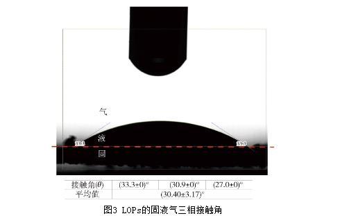 在食品工業中,濕潤性好的成分可能更容易溶解或分散,從而改善食品的質地、口感或加工性能。LOPs(固相)、水(液相)和空氣(氣相)三相之間形成的接觸角θ可用于表示LOPs對水分的親和能力。當θ小于90°時,固體顆粒優先被水濕潤,θ越小,其在水中的濕潤性及分散性越強;θ大于90°時,固體顆粒的親油性更強;θ在90°左右,固體顆粒具有兩親性,有利于其在界面的吸附與排列。LOPs的固液氣三相接觸角圖片見圖3,LOPs壓片后與超純水和空氣3次接觸形成的接觸角均為銳角,經OSA100型全自動界面黏彈性測量儀測得接觸角的平均值為(30.40±3.17)°。隨著時間的延長,最終水滴完全潤濕了LOPs壓片,實驗表明LOPs具有較好的親水性。