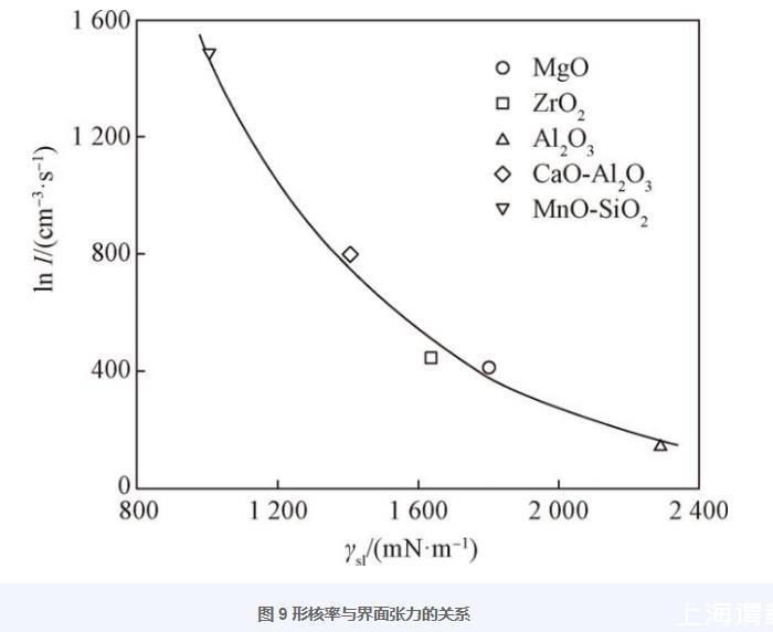 夾雜物的形核與夾雜物和鋼液間的界面張力有關,式(7)~式(9)為關于界面張力的函數。可知,夾雜物與鋼液間的界面張力降低,臨界過飽和度S*降低,夾雜物的形核率升高。