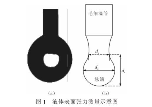 筆者采用液體表面張力的測量方法為懸滴法,即通過測量懸掛著的液滴的外形參數而推算出液體表面張力,如圖1所示。在憎水角測試儀配套的微量進樣器中滴出液滴,拍攝液滴照片,讀取液滴形態參數的像素值,根據測量滴管的實際尺寸和像素值,獲得像素值和實際尺寸的比例,換算實際液滴的尺寸參數,并根據公式推算表面張力。