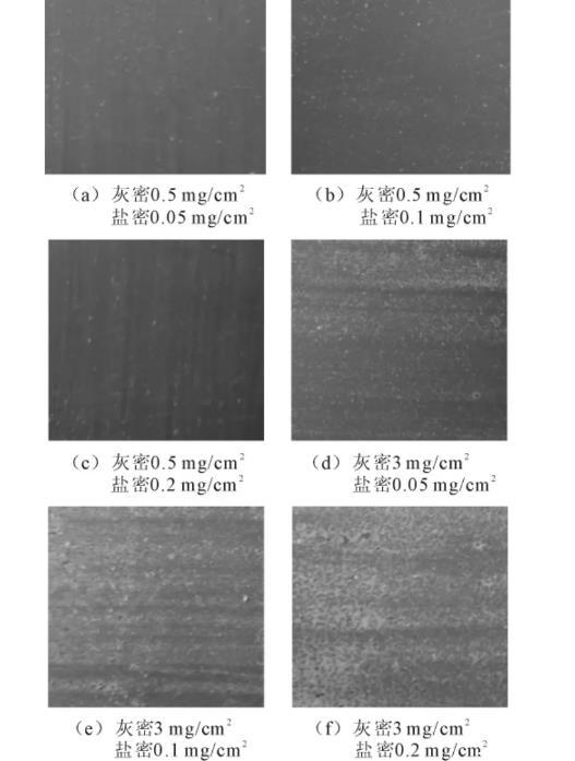 憎水角測(cè)量所用的硅橡膠試片的尺寸為100 mm×100 mm×5 mm。試驗(yàn)中為了保證試片處于相同環(huán)境中,用清水對(duì)試片進(jìn)行清洗,并用酒精擦拭后用無(wú)紡布擦干。本試驗(yàn)中的涂污方式采用固體層法中的定量涂刷法,根據(jù)IEC規(guī)程中的污層分級(jí)設(shè)置,選用灰密為0.5、3mg/cm2,鹽密值選用0.05、0.1、0.2 mg/cm2,分別代表污穢程度為“中、重、非常重”的污穢等級(jí)。涂污之前先進(jìn)行打灰處理,再將污液均勻涂抹在試片上。將涂污后的試片和潔凈試片放入相同環(huán)境中,如圖2所示。