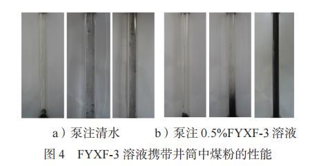 由圖4a)看出,裝有清水的有機(jī)玻璃管底部的煤粉沒有被懸浮,且泵注后,排出液中幾乎沒有攜帶出煤粉。由圖4b)看出,裝有0.5%FYXF-3溶液的有機(jī)玻璃管底部的煤粉被懸浮,且泵注后,排出液為黑色渾濁液體,攜帶出煤粉質(zhì)量為0.25g。可以看出,濃度為0.5%的FYXF-3溶液對煤粉的懸浮性能較好,可以將井筒堆積的韓城現(xiàn)場煤粉懸浮,并隨著返排液返排至地面。