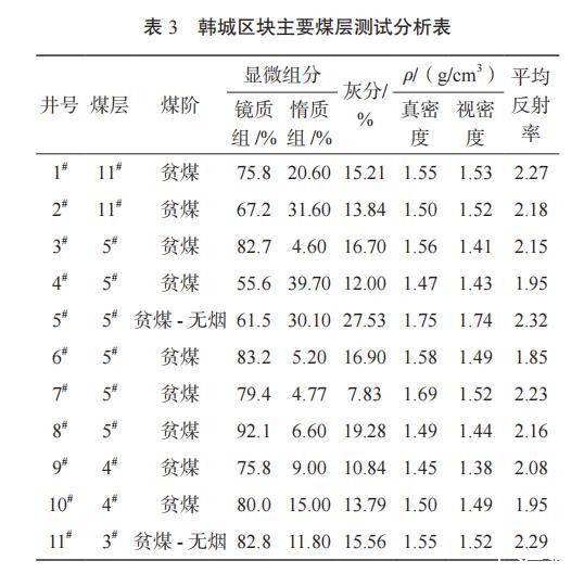 對表3綜合分析可得,韓城主要目的煤層以貧煤和貧煤-無煙煤為主,屬于中高階煤,含氣量較高;相同的演化條件下,惰質(zhì)組產(chǎn)氣率最低,鏡質(zhì)組產(chǎn)氣率是惰質(zhì)組的4.3倍。說明韓城區(qū)塊鏡質(zhì)組的含量相對比較高,含氣量較好,通過合理壓裂改造能獲得較好的產(chǎn)能;各井組的同一層系間差異較大,韓城區(qū)塊煤層的非均質(zhì)性非常強(qiáng)。
