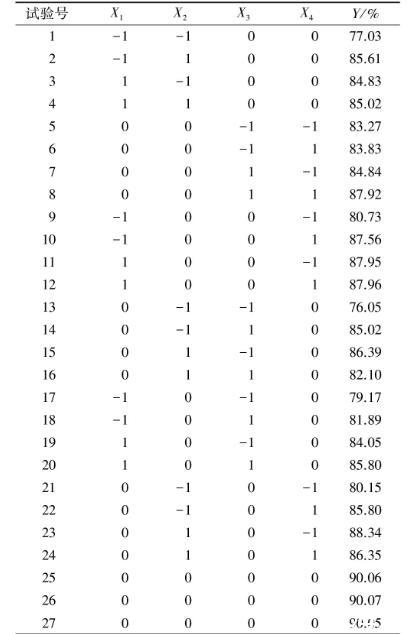 以單因素試驗為基礎,固定反應時間為2 h,以N-椰子油酰基復合氨基酸產率為響應值(Y),復合氨基酸溶液與椰油酰氯體積比(X1)、pH(X2)、反應溫度(X3)、丙酮與復合氨基酸溶液體積比(X4)為影響因素,根據Box-Behnken的試驗設計原理,通過SAS軟件對試驗數據進行回歸分析,確定最佳工藝。響應面試驗因素水平見表1,響應面試驗方案及結果見表2,回歸方程方差分析見表3。