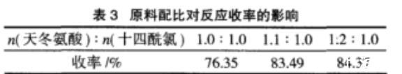 采用天冬氨酸稍過(guò)量,一方面可以抑制酰氯的水解,另一方面又有利于提純。選取n(天冬氨酸)∶n(十四酰氯)=1.0~1.2∶1.0。在反應(yīng)體系pH=10~11、反應(yīng)時(shí)間3.5h、反應(yīng)溫度5℃條件下,考察不同原料配比對(duì)反應(yīng)的影響,結(jié)果如表3所示。