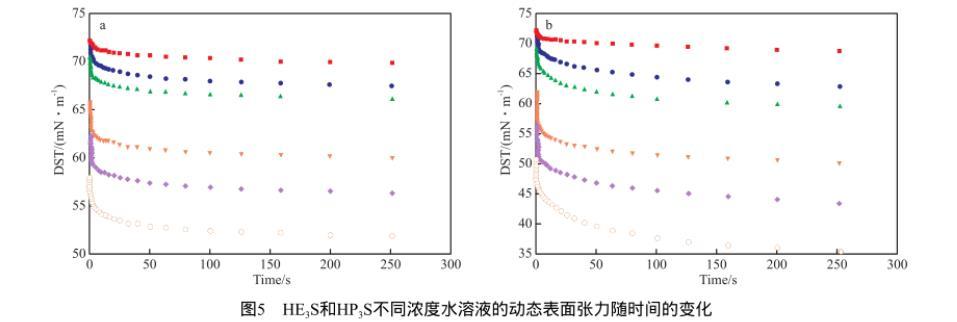 圖5為298 K時不同濃度的HE3S和HP3S水溶液的動態(tài)表面張力隨時間的變化。