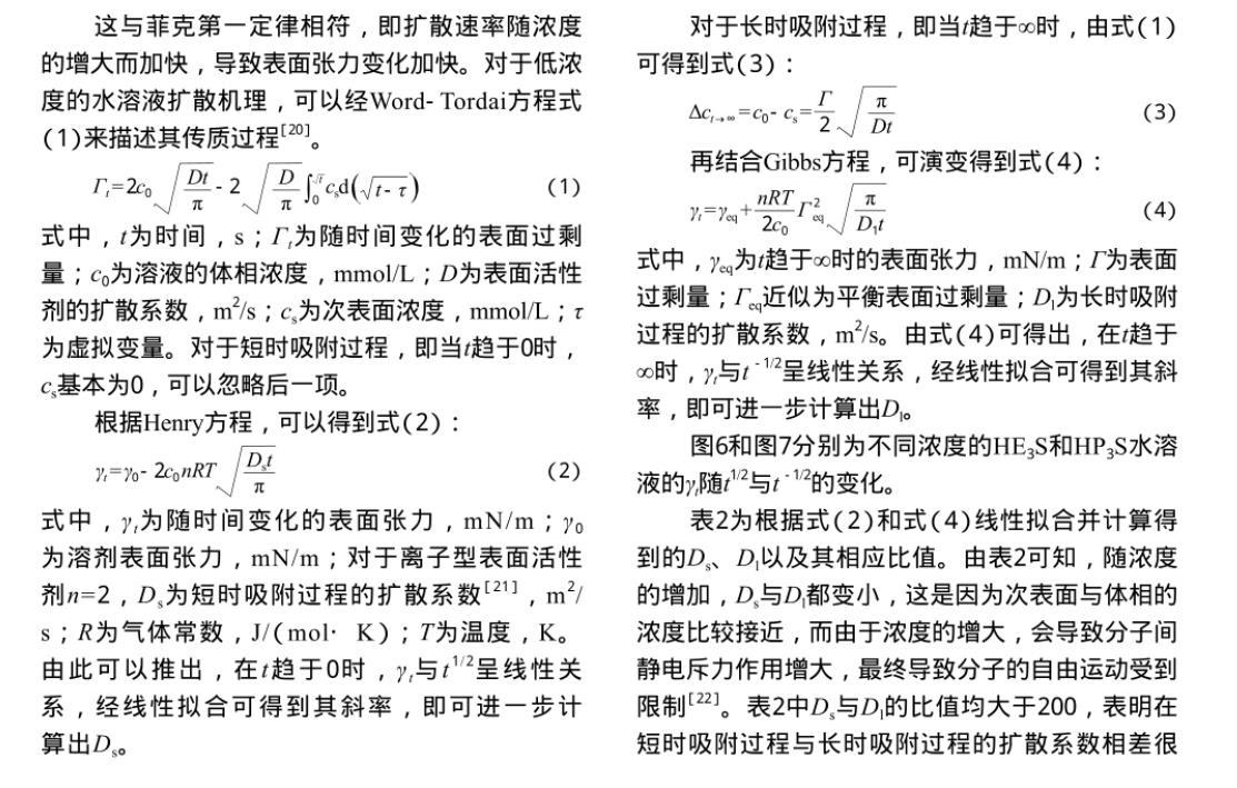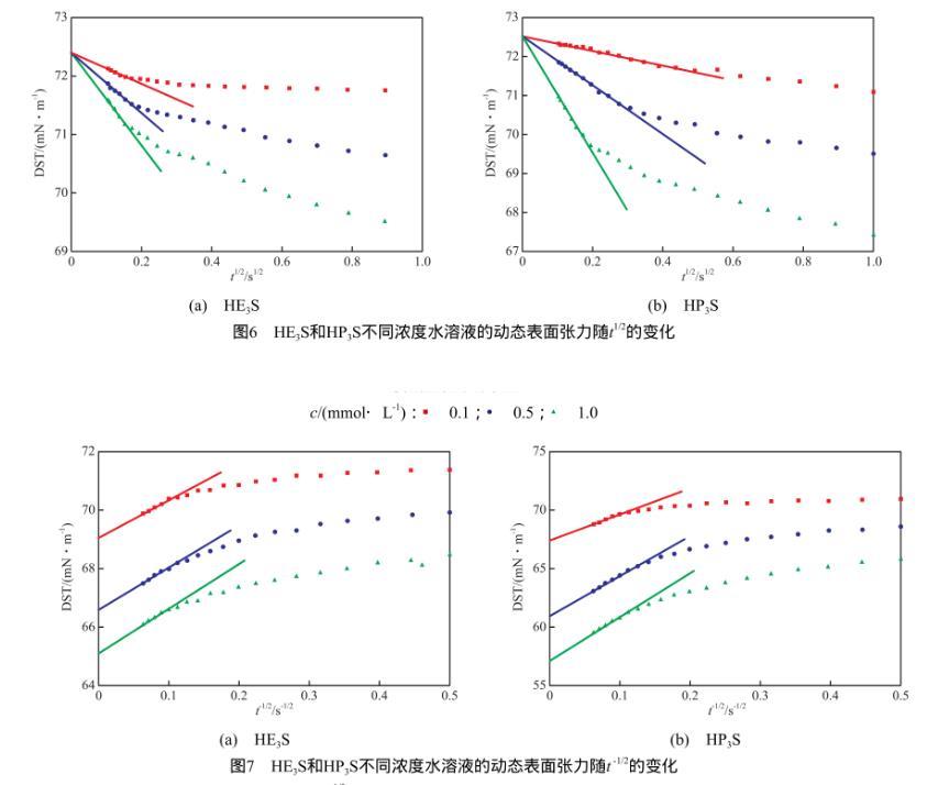 2)水溶液中的HE3S和HP3S分子可以快速擴(kuò)散到氣-液界面,迅速降低表面張力并達(dá)到平衡值,對于低濃度水溶液,這兩種表面活性劑的吸附過程都屬于混合動力控制吸附。