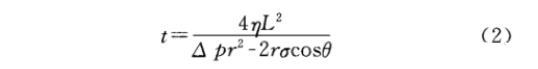 從式(1)可以看出,助排劑的表/界面張力越低,巖石越接近中性潤(rùn)濕,則毛細(xì)管力越小,越有利于返排。另外,根據(jù)Poiseulle方程,當(dāng)排驅(qū)壓差為△p(MPa)時(shí),從半徑為r(m),長(zhǎng)為L(zhǎng)(m)的毛細(xì)管中排出黏度為η(mPa·s),表面張力為σ(mN/m)和接觸角為θ(°)的液體所需時(shí)間t(s)的表達(dá)式為: