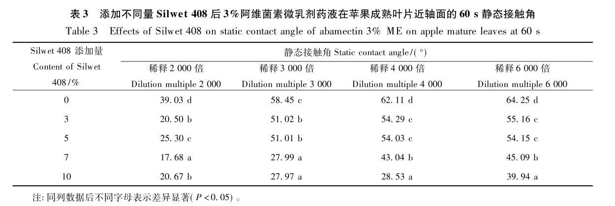 添加Silwet408可顯著改變3%阿維菌素微乳劑藥液在蘋果成熟葉片近軸面的靜態(tài)接觸角。其中,稀釋2000~4000倍時,添加Silwet408后阿維菌素微乳劑藥液在成熟葉片近軸面的靜態(tài)接觸角在17.68~55.16°之間,均顯著低于未添加Silwet408時的靜態(tài)接觸角(39.03~64.25°)(表3)。與嫩葉相比,藥液在成熟葉片上的靜態(tài)接觸角更小,說明藥液更易潤濕成熟葉片;同時,與蘋果嫩葉上的變化規(guī)律相同,隨著藥液稀釋倍數(shù)增加,其靜態(tài)接觸角呈增大趨勢。