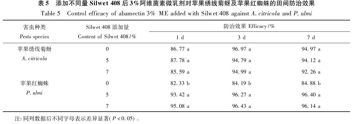 綜合表面張力、接觸角及室內(nèi)毒力測定結(jié)果,選擇Silwet408添加量分別為5%和7%的阿維菌素微乳劑藥液進(jìn)行了田間防效試驗。結(jié)果(表5)與室內(nèi)毒力試驗結(jié)果規(guī)律基本一致:添加Silwet408對提高阿維菌素微乳劑對蘋果紅蜘蛛田間防治效果作用顯著,而對蘋果繡線菊蚜防效的影響則不明顯,再次證明Silwet408雖可有效降低阿維菌素微乳劑的表面張力和接觸角,但卻未必一定能提高其對不同害蟲的防效。