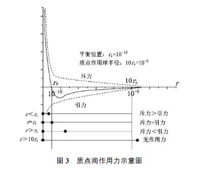 由熔體作用力理論可知,組成熔體的質點間存在著作用力。當質點處于平衡位置時,即質點間距r=r0(r0=10?1?)時,引力等于斥力,質點間作用力為0;質點間距r>r0,作用力為引力;質點間距r<r0,作用力為斥力;當質點間距r>10r0時,引力和斥力均為0,如圖3所示。
