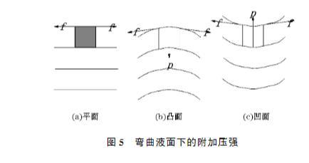 如果熔體表面是凸面,如圖5b所示,因表面張力沿周界與熔體面相切,則沿周界各個方向的表面張力f將產生一個指向熔體內部的合力p(正壓力),使得熔體表面曲率變小。如果液面是凹面,如圖5c所示,表面張力的合力將指向熔體外部,對熔體則產生一個負壓力,使得凹面變平,甚至有可能轉化為凸面。由于表面張力的作用,熔體表面能夠截凸補凹,自動修復,表面平滑,這正是陶瓷釉層表面能夠平整光滑的主要原因。
