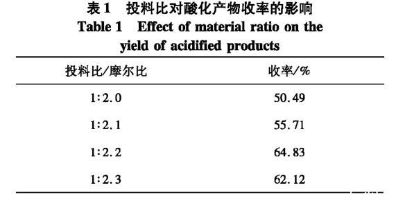 2.2.1N,N-丙二胺二乙酸鈉的合成條件優化N,N-丙二胺二乙酸鈉的合成反應中,不同反應條件會生成不同的丙二胺取代產物;為了得到目標產物N,N-丙二胺二乙酸鈉,同時減少其它副取代產物,采用單因素分析法研究了丙二胺和氯乙酸鈉的投料比對目標產物丙二胺二乙酸鈉收率的影響。由于丙二胺二乙酸鈉溶解在混合溶劑中無法提取,因此采用酸化處理的辦法得到其酸化物N,N-丙二胺二乙酸,通過對比中間體酸化物的收率來確定合成目標中間體所需的最佳投料比(摩爾比),結果見表1。