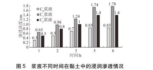 從圖5的試驗(yàn)結(jié)果可知:3種漿液在開(kāi)始滲透后的3h內(nèi)浸潤(rùn)滲透速度相對(duì)較快,3~5h之間,浸潤(rùn)滲透速度相對(duì)變慢,5h后浸潤(rùn)滲透高度趨于穩(wěn)定。在相同時(shí)間內(nèi),漿液在黏土中的浸潤(rùn)滲透高度C1>C2>C0。滲透穩(wěn)定后,C1、C2漿液在黏土中的浸潤(rùn)滲透高度比C0漿液的浸潤(rùn)滲透高度分別提高了109.4%和64.7%,說(shuō)明表面活性劑可以提高漿液的滲透性,且表面活性劑S1提高漿液滲透性的幅度更大。