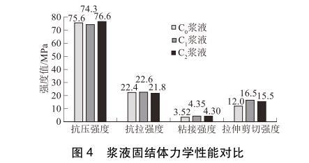 3種漿液固結(jié)體力學(xué)性能對(duì)比見(jiàn)圖4。由圖4可以看出:3種漿液固結(jié)體抗壓強(qiáng)度和抗拉強(qiáng)度數(shù)值差別不大,說(shuō)明表面活性劑對(duì)漿液固結(jié)體的抗壓強(qiáng)度和抗拉強(qiáng)度無(wú)影響。但C1、C2漿液的粘接強(qiáng)度和拉伸剪切強(qiáng)度明顯高于C0漿液的粘接強(qiáng)度和拉伸剪切強(qiáng)度。其中C1漿液的粘接強(qiáng)度和拉伸剪切強(qiáng)度比C0漿液分別提高了23.6%和37.5%;C2漿液的粘接強(qiáng)度和拉伸剪切強(qiáng)度比C0漿液分別提高了22.2%和29.2%。其原因在于表面活性劑的加入降低了漿液的接觸角,使?jié){液有更好的浸潤(rùn)性和潤(rùn)濕性,從而提高了漿液的粘接強(qiáng)度和拉伸剪切強(qiáng)度。