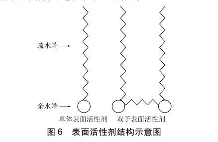 從圖3中可以看出加入表面活性劑S1、S2能降低漿液的表面張力和接觸角。這是因?yàn)楸敬螡{液改性選用的表面活性劑S1、S2從化學(xué)結(jié)構(gòu)上屬于雙子型非離子表面活性劑。傳統(tǒng)表面活性劑和雙子型表面活性劑結(jié)構(gòu)示意圖如圖6所示。