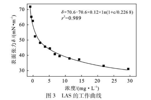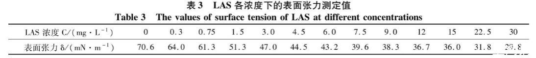 LAS是應用最廣泛的陰離子表面活性劑,是我國合成洗滌劑活性物的主要構成,可用作洗衣粉、香波、金屬清洗劑、脫墨劑等產品的原料,分析其生物降解性能十分必要。LAS試樣在不同濃度時測定的表面張力結果見表3。