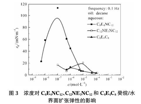 圖3濃度對C8E4NC12、C12NE3NC12和C8E4C8癸烷/水界面擴(kuò)張彈性的影響