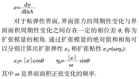 當(dāng)界面受到周期性壓縮和擴(kuò)張時(shí),界面張力也隨之發(fā)生周期性變化,擴(kuò)張模量ε定義為界面張力(γ)變化相對于相對界面面積(A)變化的比值。即
