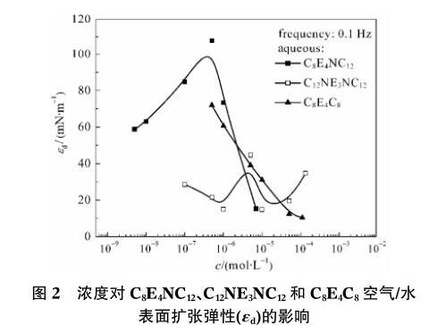 圖2濃度對C8E4NC12、C12NE3NC12和C8E4C8空氣/水表面擴(kuò)張彈性(εd)的影響