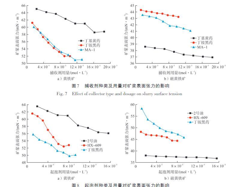 為研究捕收劑種類及用量對礦漿表面張力的影響,將黃鐵礦與磁黃鐵礦配成30%濃度的礦漿,起泡劑2號油用量3×10-5 mol/L、粒度-0.074 mm占比80%、pH=7,改變捕收劑種類及用量以測定礦漿表面張力,結(jié)果見如圖7。