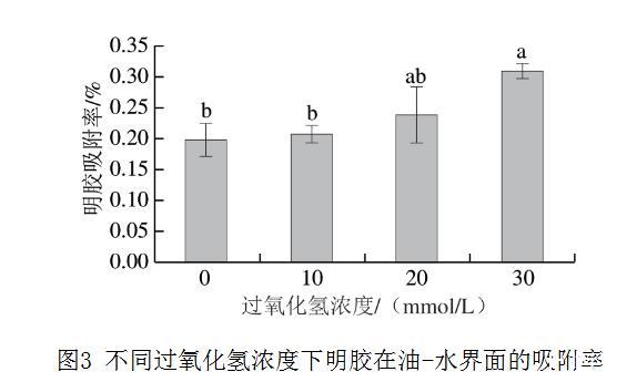 如圖3所示,乳液中油-水界面的明膠吸附率隨著過氧化氫濃度的增加而增加,從對照組的19.8%增加到30 mmol/L過氧化氫組的30.9%,增加1 倍左右,這表明更多氧化明膠分子吸附到油-水界面。Chen Jiahui等對肌原纖維蛋白進行超聲處理,發現超聲處理改變了肌原纖維蛋白的結構,從而有利于形成尺寸更小、更靈活的聚集體,促進蛋白質在油-水界面的吸附,減少油-水界面的界面張力。在米糠蛋白的氧化中也觀察到類似的現象。氧化導致米糠蛋白中暴露出更多的疏水基團,促進了蛋白質在油-水界面的吸附,形成黏彈性膜,降低界面張力,使液滴分裂成更小的尺寸。相似地,Zou Heinan等利用高強度超聲處理減小了貽貝肌漿蛋白的尺寸并增強了其表面疏水性,從而增加了蛋白質在油-水界面的吸附。