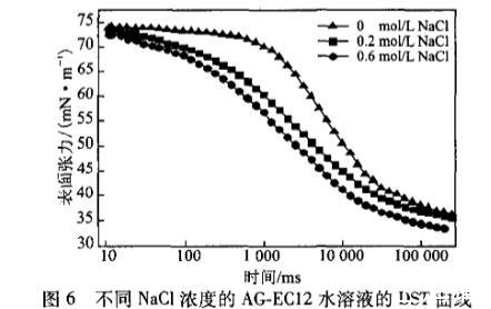 平衡張力研究表明,三種烷基糖苷檸檬酸單酯鹽在其各自的水溶液中均具有表面活性。動(dòng)態(tài)表面張力研究表明,同摩爾濃度AG—EC08、AG.ECIO和AG—EC12水溶液的動(dòng)態(tài)表面活性在達(dá)到一定時(shí)間后隨表面活性劑分子的疏水鏈增長(zhǎng)而不斷增大;AG—EC溶液的濃度越高,其動(dòng)態(tài)表面活性越好,DST越快平衡,DST曲線越低。而當(dāng)溫度升高,其DST明顯下降;無(wú)機(jī)電解質(zhì)NaC1對(duì)其DST的影響也較明顯,隨著NaC1濃度增大,其DST曲線越低。