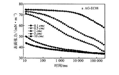 由圖3可知,對(duì)于不同鏈長(zhǎng)的AG.EC水溶液,其DST曲線都是微微下降一快速下降一緩慢平衡的過(guò)程。另外在疏水鏈變長(zhǎng)的同時(shí),DST曲線的誘導(dǎo)期時(shí)間縮短,DST下降趨勢(shì)增加,介平衡狀態(tài)表面張力值越低。這是由于疏水烷基鏈增長(zhǎng)使得表面活性劑的疏水性增強(qiáng),更容易吸附到溶液的表面。