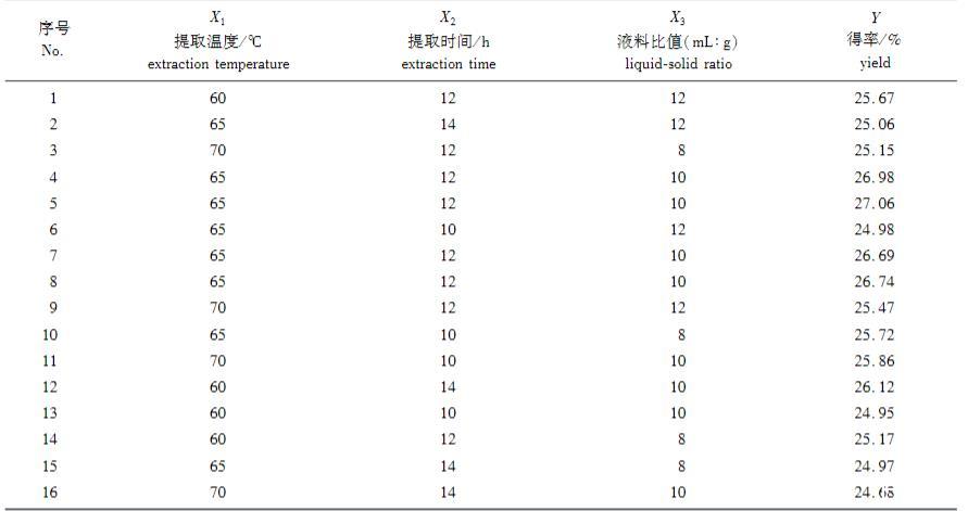 通過軟件分析得到肥皂莢皂苷的最優(yōu)提取條件為:溫度69.20℃、時(shí)間11.28 h、液料比值9.89,皂苷得率的預(yù)測(cè)值為26.44%。為了操作方便,修正提取條件為:溫度69℃、時(shí)間11 h 15 min、液料比值為10。在此條件下對(duì)肥皂莢皂苷進(jìn)行水浸提,并做3次重復(fù)性實(shí)驗(yàn),平均得率為26.49%,與理論值誤差僅為0.05%。表明該模型可以較好地預(yù)測(cè)肥皂莢皂苷的提取工藝。