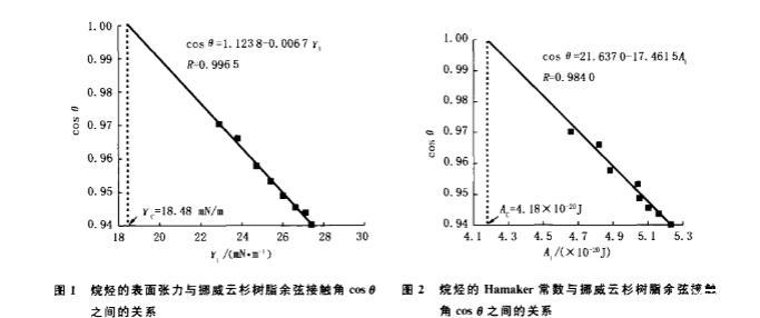 圖1烷烴的表面張力與挪威云杉樹脂余弦接觸角cos0之間的關系