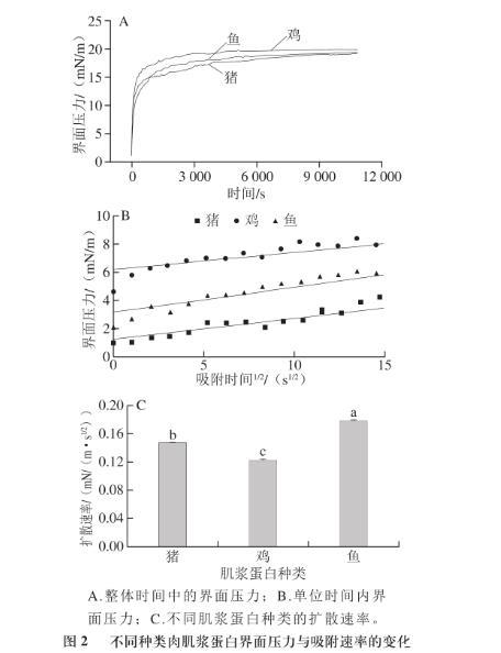 由圖2可知,不同種類肌漿蛋白的動力學擴散速率間存在差異性。蛋白質分子在界面上的擴散速率受其粒徑大小的影響,而本實驗結果更能解釋這一現(xiàn)象。在前述理化指標中,粒徑大小為雞肉肌漿蛋白>豬肉肌漿蛋白>魚肉肌漿蛋白,而在本部分擴散速率大小為雞肉肌漿蛋白<豬肉肌漿蛋白<魚肉肌漿蛋白。這可能是由于大粒徑的肌漿蛋白產生的空間位阻在一定程度上削弱了表面疏水性提高帶來的吸附速率增加。而且魚肉肌漿蛋白的擴散速率較豬肉和雞肉肌漿蛋白間顯著較大(P<0.05),但雞肉與豬肉肌漿蛋白之間的擴散速率卻無顯著性差異(P>0.05)。