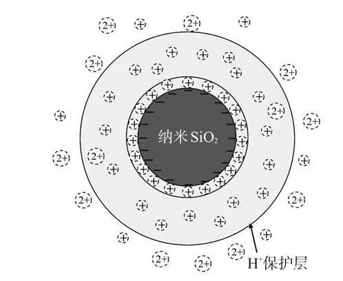 SiO2表面的羥基會和H+發生反應,所以和Ca2+、Mg2+、Na+離子相比,H+更容易吸附在納米顆粒表面。當體系中含有足夠量的H+時,H+離子可以在納米SiO2周圍形成保護層,如圖4所示。模擬地層水中極少量的二價Ca2+、Mg2+也會使納米SiO2失去穩定性,H+保護層的存在降低了納米SiO2雙電層中二價離子的含量,從而減少了二價陽離子對納米SiO2穩定性的破壞。