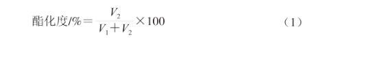 稱取100 mg不同脫酯果膠溶解于30 mL去離子水中,攪拌過夜。滴定前向果膠溶液中滴加3滴酚酞作為指示劑,用0.1 mol/L氫氧化鈉滴定液將果膠溶液滴定至顏色變?yōu)榉奂t色,記錄消耗的滴定液體積V1。向體系中加入10 mL 0.1 mol/L氫氧化鈉溶液,脫酯15 min后,再加入10 mL 0.1 mol/L鹽酸溶液。然后用0.1 mol/L氫氧化鈉滴定液滴定體系中過量的鹽酸,直至顏色變?yōu)榉奂t色,記錄滴定液消耗量(V2)。按式(1)計算果膠酯化度: