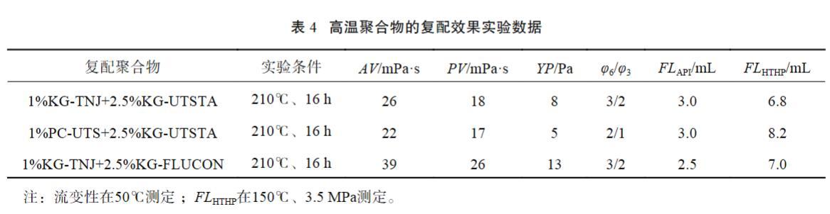室內(nèi)以濾失改善效果較好的1%DrilFILHT為基礎(chǔ),考察增黏劑KG-TNJ、PC-UTS與2種抗超高溫改性淀粉的復(fù)配效果,選定材料最佳組合。評(píng)價(jià)配方:基礎(chǔ)配方+1.0%DrilFILHT+復(fù)配聚合物,實(shí)驗(yàn)結(jié)果見(jiàn)表4。