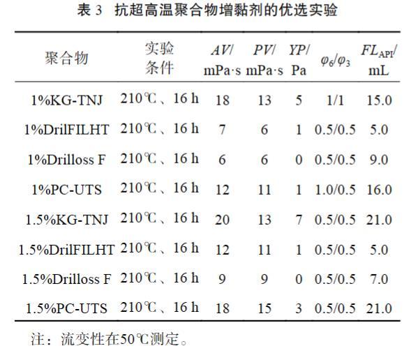 室內(nèi)對(duì)4種高溫聚合物增黏劑材料進(jìn)行了單劑抗溫性能對(duì)比評(píng)價(jià)。其中KG-TNJ為溫敏疏水締和聚合物提黏劑,DrilFILHT為納米片狀氧化鎂酚醛樹(shù)脂改性聚合物增黏降濾失劑材料,Drilloss F為納米微球聚合物復(fù)合增黏聚合物材料,PC-UTS為某國(guó)外代表性高溫聚合物材料。評(píng)價(jià)配方:基礎(chǔ)配方+2.5%KG-UTSTA+聚合物,實(shí)驗(yàn)結(jié)果見(jiàn)表3。