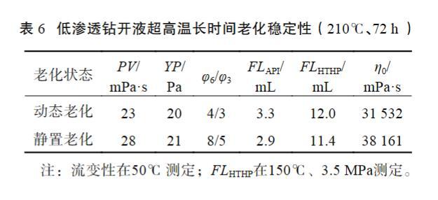 表6低滲透鉆開(kāi)液超高溫長(zhǎng)時(shí)間老化穩(wěn)定性(210℃、72 h)