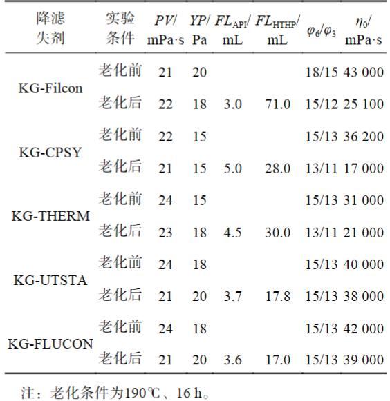 為避免超高溫下材料間的相互影響干擾判斷,室內(nèi)在190℃下先固定KG-TNJ作為增黏劑材料不變,對(duì)5種改性淀粉類高溫降濾失劑材料進(jìn)行了初選。其中,KG-Filcon為海上常用抗高溫改性淀粉;KG-CPSY和KG-THERM均為聚合物接枝改性抗高溫淀粉;KG-UTSTA和KG-FLUCON均為室內(nèi)使用2-丙烯酰胺基-2-甲基丙磺酸AMPS、聚苯乙烯乳液與可溶性淀粉在堿性條件下通過(guò)接枝共聚生成抗超高溫改性淀粉,2者區(qū)別在于KG-UTSTA為機(jī)械攪拌條件下共聚合成,KG-FLUCON為超聲波機(jī)械協(xié)同方式混勻后再進(jìn)行合成。評(píng)價(jià)配方:基礎(chǔ)配方+1.0%KG-TNJ+2.5%降濾失劑,實(shí)驗(yàn)結(jié)果見(jiàn)表2。由表2可知,190℃老化后,各體系的流變性能穩(wěn)定,KG-UTSTA和KG-FLUCON體系的高溫高壓降濾失性最好,濾失量小于20 mL,KG-CPSY和KG-THERM體系的高溫高壓降濾失性能次之。分析原因?yàn)楦男缘矸鄱家肓丝垢邷亟又簿蹎误w,但是KG-FLUCON、KG-UTSTA除了引入AMPS類抗高溫單體外,還引入聚苯乙烯乳液,增加了接枝改性的抗高溫基團(tuán)和空間結(jié)構(gòu),通過(guò)聚苯乙烯乳液組分的吸附、滲透、覆蓋包裹特性增強(qiáng)了對(duì)淀粉結(jié)構(gòu)的高溫保護(hù)作用和產(chǎn)物的成膜封堵性能,改善了其抗高溫性和濾失造壁。