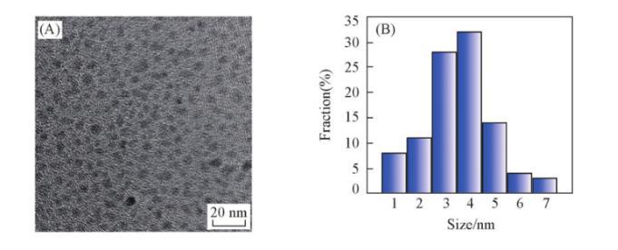 通過(guò)傅里葉變換紅外光譜(FTIR)、透射電子顯微鏡(TEM)和X射線衍射(XRD)對(duì)DA-GQD的結(jié)構(gòu)進(jìn)行表征。從FTIR譜圖(圖S1,見(jiàn)本文支持信息)可知,DA-GQD可能包含C—H,O—H,O═C(R)—和C—N基團(tuán)。從TEM和粒徑分布圖(圖2)可以看出,DA-GQD顆粒比較均勻,基本上為橢球形納米顆粒,粒徑主要分布在1~7 nm,平均粒徑約為3.5 nm。XRD譜圖(圖S2,見(jiàn)本文支持信息)中在20°左右有一個(gè)較寬的峰,說(shuō)明合成的DA-GQD具有石墨烯結(jié)構(gòu)。